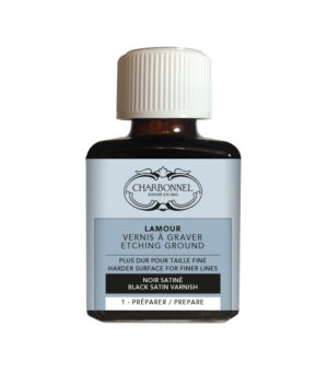 Black Satin Lamour Liquid Ground is an opaque liquid engraving ground. It is a great alternative to solid engraving ground.It dries hard with a satin finish. Unlike solid ground, this Liquid Ground is incredibly durable. Once applied, you don’t need to worry about the ground chipping off. Giving you plenty of time to engrave your plate.Containing petrol essence, it dries quicker than our Ultraflex Engraver Varnish.