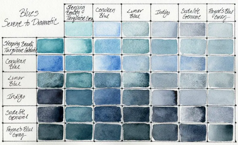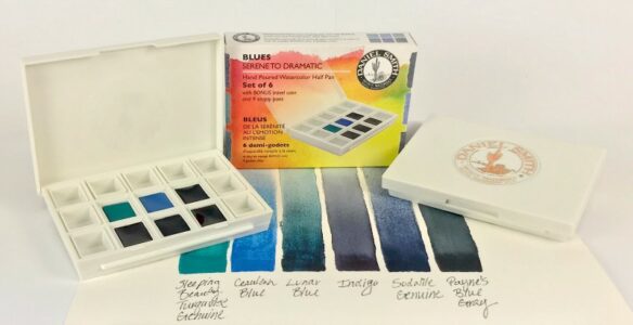 Daniel Smith Blues serene to dramatic Half Pan 6 Set ”Blå är en färg förknippad med lugn, evighet, humör och välbefinnande – det finns runt omkring oss. Även om det är en av de tre primärfärgerna, kommer blått i en mängd olika nyanser, var och en med sin egen unika personlighet och egenskaper. Dessa färger kan blandas för att skapa nästan vilken blått som helst du kan tänka dig. Vid ett tillfälle i Europas historia var det bara de mycket rika som kunde njuta av lyxen med blå färg. Enligt min mening kan man aldrig ha för många olika blues!” – Julie Ann Karlsson