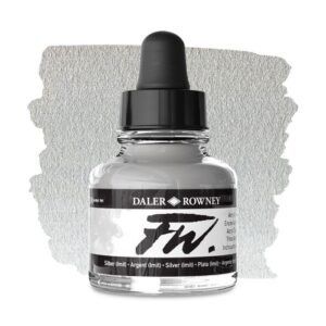 FW Silver Artists’ Ink flytande akrylbläck från Daler-Rowney är en extremt flytande akrylfärg (akryltusch) med intensiva färgpigment. Den är snabbtorkande, permanent, vattenresistent och klumpar inte ihop sig, vilket gör den lämplig för en mängd olika tekniker och underlag. Akryltuschen finns i 44 kulörer och fungerar utmärkt för penselmålning av små figurer, airbrushing med spruta och tekniska pennor.