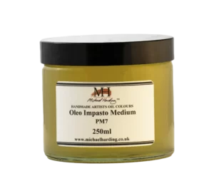 Michael Harding Oleo Impasto Medium PM7 är en gel gjord av pyrogen kiseldioxid och linfröolja, vars kombination ger stor ljusstyrka, särskilt med transparenta färger. Använd denna i varierande mängd med en borste eller kniv för att få extra kropp.