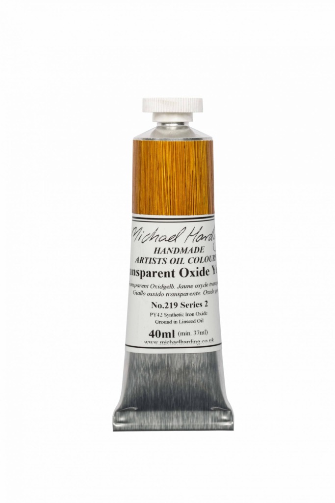 Michael Harding Transparent Oxide Yellow oil. Denna järnoxid har använts som träfärg, och jag insåg att dess förmåga att framhäva träets ådring gör den perfekt för färgtillverkning. Den har en härlig värme med ingefärstoner, helt olik de som syns i Indian Yellows. Pigmentpartiklarna är så små att den nästan kan misstas för ett lakepigment. Den har stor täckkraft och drar in vitt och andra gula nyanser i en gyllene, rik Titianesque zon med varma, mörka toner. Prova den tillsammans med Aureolin och jordfärger.