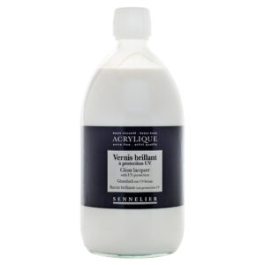 Sennelier Gloss lacquer UVLS. Den kan appliceras med en pensel eller pensel på en helt torr yta. Innehåller anti-UV-medel, skapar den en skyddande film som dämpar färgernas ljusstyrka och är resistent mot de skadliga effekterna av ljus och mot repor. Används som den är eller utspädd i vatten. Den kan blandas med matlack för att få en skräddarsydd satinfinish. Interiör eller exteriör användning. Genomskinlig, ej gulnande, vattenbeständig och irreversibel när den är torr.