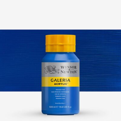 W&N Galeria Process Cyan acrylic vattenbaserad akrylfärg från Winsor & Newton. Galeria Akrylfärg är en underbar tjock akrylfärg som bevarar penseldrag vid målning. Det gör att den är skräddarsydd för konstnärer som använder mycket färg och vill ha en stabil produkt som de kan lita på och som är prisvärd. Winsor & Newton Galeria akrylfärg har hög pigmenthalt, hög opacitet (opacitet) och beständighet. Akrylfärg är en tjock pasta som bevarar penseldrag vid målning. Galeria akrylfärg 500ml – 60 färger gör W&N Galeria akrylfärg till en konkurrenskraftig akrylfärg på marknaden. Alla Galeria akrylfärger är graderade AA eller A, förutom Opera Rose, och som vi rekommenderar för användning av konstnärer. Det betyder att de har god livslängd och ljusbeständighet. Winsor & Newton har otroligt höga ambitioner vilket har gjort dem till en stor aktör i artistvärlden. W&N Galeria Process Cyan acrylic